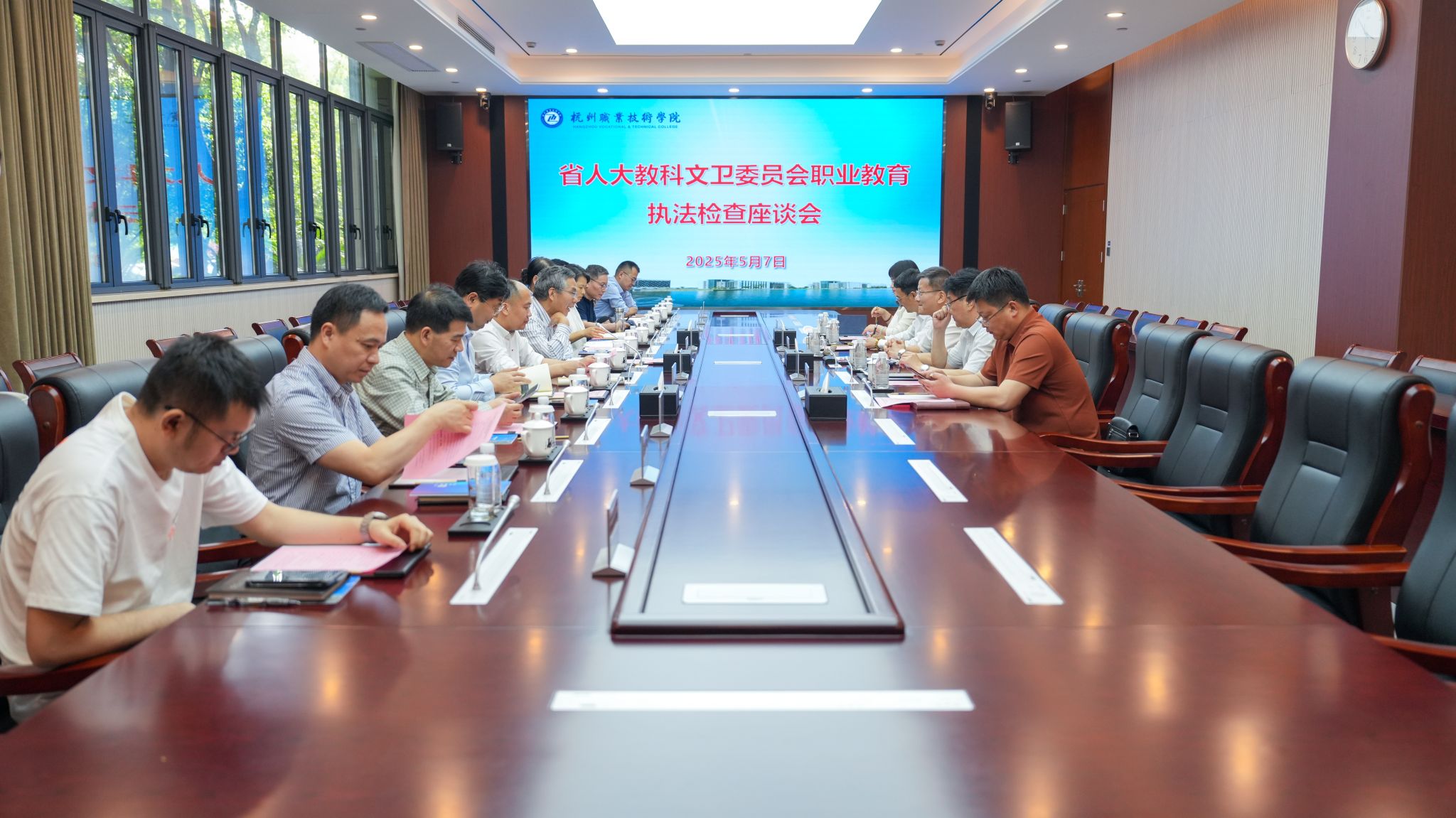 5月7日,浙江省人大常委会委员、教科文卫委员会副主任委员张国强率队来校调研职业教育法执法情况。杭州市人大常委会副主任罗卫红,市教育局党组成员、副局长孙青峰等有关同志陪同调研。学校党委书记陈文岳、副校长楼晓春、技工院校负责人以及校企合作企业代表等参加了调研座谈。