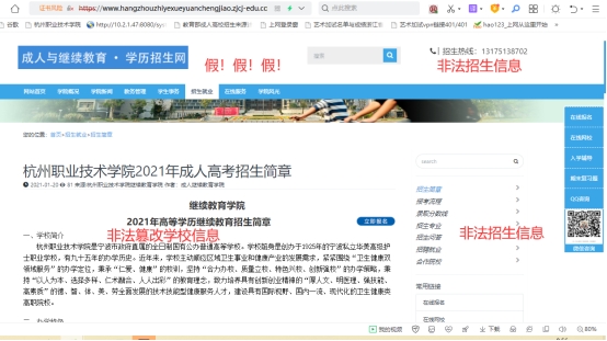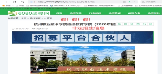 近期,我校工作人员接到部分考生举报,有社会机构冒充我校虚假招生的信息,非法收取费用;同时部分网站模仿学校主页、篡改学校相关信息,非法发布我校继续教育招生信息、误导考生非学校官方咨询和报名方式,行为恶劣。为此,我校郑重提醒广大考生、学生家长,杭州职业技术学院未委托任何机构、任何个人、任何网站发布成人学历教育招生信息,一切招生信息以杭州职业技术学院官网发布为准。请广大考生留意,切勿轻信,谨防上当受骗。
